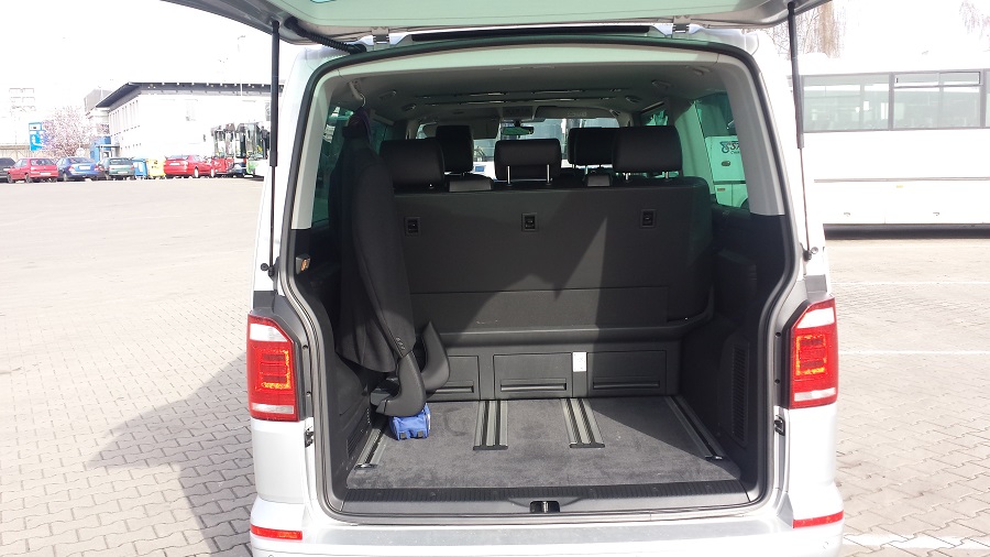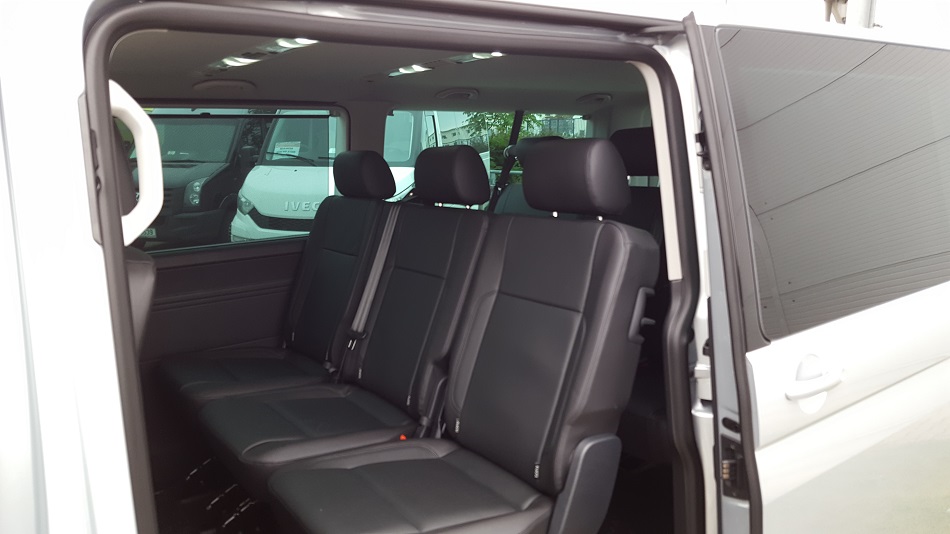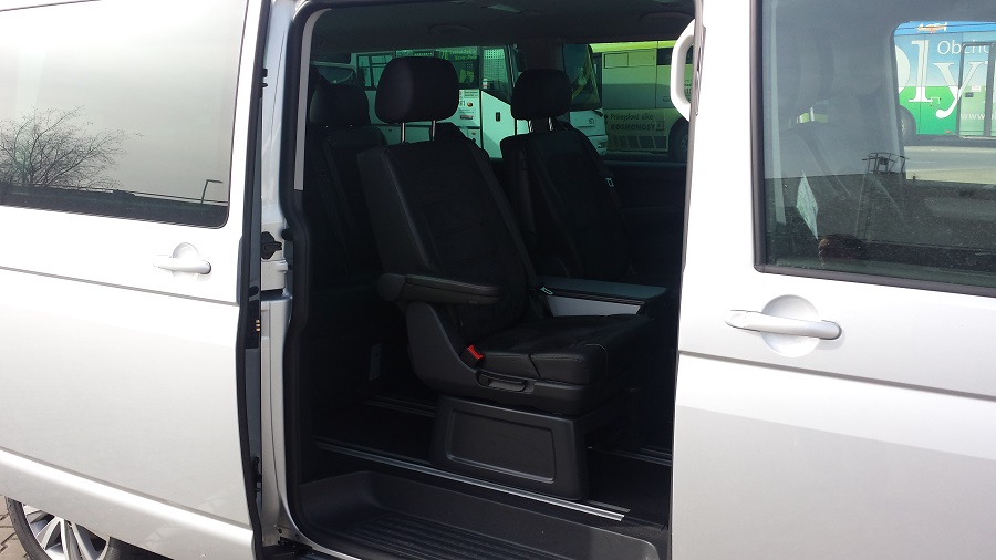 VW Multivan, stříbrné barvy, rok výroby 2018, je verzí VW je ještě komfortnější verzí VW Caravelle. Nabízí 6 míst pro cestující a plnou výbavu včetně stolku mezi cestujícími. Nabízí vysoký komfort na kožených sedadlech a reprezentativní vzhled. Vůz je v prodloužené verzi, nabízí větší zavazadlový prostor.